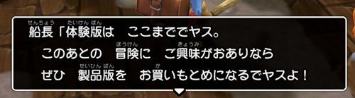 そしてさっそくモンゾーラに行こうとすると、船長さんに無慈悲な事を言われてしまいます。体験版はここまでとなっています。