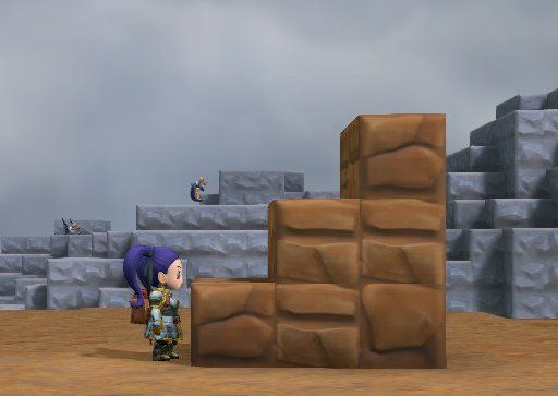 そんな仕様変更はさておき、まず初心者の方などは「目線が上がる、下がる」の意味がわからないかも知れないので、今度はその説明です。上のSSのようにLボタンを押すと主人公が少し上の方を向きます。これが「目線が上がった」状態で、これによってブロックを掘る先と置く先を変えられるようになっています。今作では先に上のブロックが掘れるので使う事は減りましたが、置くときには結構使うボタンです。ただこれで掘れる範囲が変わる事はありません。もっとストーリーを進めたら何か道具がでる可能性はありますが、今の所3人称視点で下から3段目を掘るにはジャンプするか足場を作るしか手がありません。