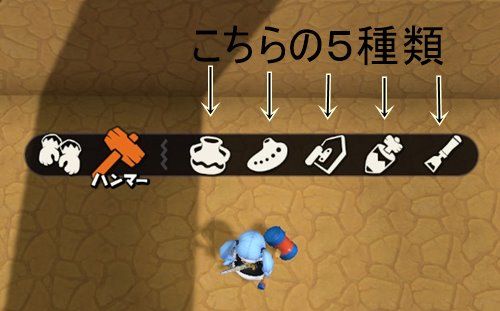 ビルダー道具を全部集めた後の「Aボタン長押し」で出る画面はこうなります。8種類なんですが、最後にもらえる「ビルダーアイ」は別の扱いらしくこちらには出ません。そして間に線があるのがわかるかと思いますが、実は「Aボタンで簡単に切り替え」ができるのは、線の左側の2種類と右側の中の1種類というルールなんです。上のSSで書いた「グローブ」と「ハンマー」は「簡単切り替え」の方から外せません。