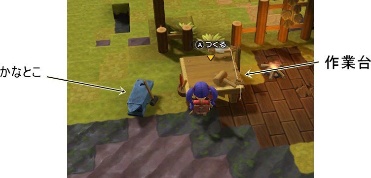 今回はこのあと「かかし」を作って畑作りに進むという流れの前に、作業台について書いておきます。ビルダーズ1と違ってビルダーズ2には「かなとこ」という作業台があります。上のSSに書きましたが、右にあるのが「木の作業台」で左に「かなとこ」があります。前作では「かなとこ」と同じ感じの物が「炉」のかざり部分に付いていたので勘違いしそうになりますが、別の作業台なので別々に回収して場所を移動する事もできます。
