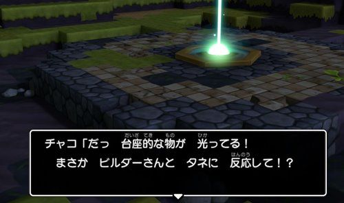 しかもこのタネをもらったとたんに「台座的な物」が光りだしました。それにしても「台座的な物」って、またしても謎の物体です。それがビルダーとタネに反応しているようです。