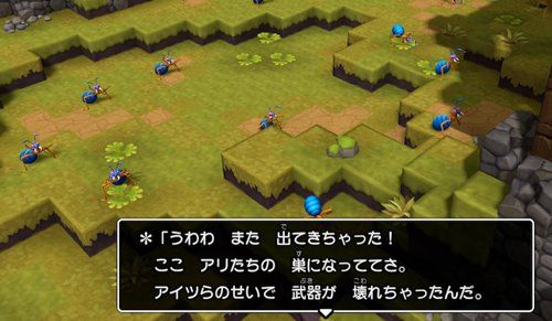 装備が出来上がったら、いつものようにXボタンでひのきのぼうを渡しましょう。そうすると彼女が感謝してくれるんですが、その後一気に魔物が押し寄せてきます。このアリと戦って前の武器が壊れてしまったみたいですね。