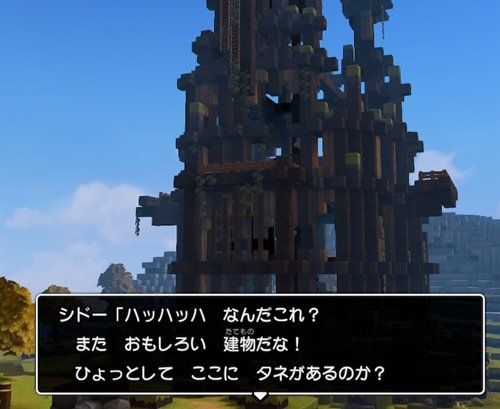 ヒントの通りに進んでいくと、なんだか大きな建物の跡が見えます。どうやら風車だった物に見えます。そこに「!マーク」もあるので、たぶんあの建物に行くのが正解ですね。