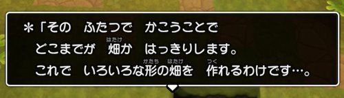 しかもさらにこんなことを言い出しましたよ。畑を木の柵でかこうとどうなるんでしょう?木の柵はこの時点では自分で作れないんですが、畑の後ろの方にあると教えてもくれます。