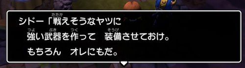 話しかけると「戦えそうな人に強い武器を装備させろ」と言われます。もちろんシドー君にもだそうです。ここで皆さんも、一度NPCの方の装備は確認した方がいいかもです。選択肢が出たら「いいえ」にして、確認してください。