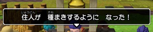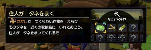 「種まき」を住民にしてもらうためには、「かかしで指定する」事と「タネを収納箱に入れる」事が必要になります。「かかし」の方は近づいてAボタンで「調べる」をすると、メニュー画面が出ますので、そこで作物を指定してください。そうすれば住民がその畑にはそのタネだけを植えるようになります。当然畑ごとに作物を変える事もできます。注意点としてはここには「自分で収穫した事のある」作物だけしか出ません。自分で植えた物でも、NPCしか収穫した事がない物は指定できないという事です。もし畑で育てた事があるのにメニュー画面に出ない物があったら「自分で収穫」してください。それで出るようになります。